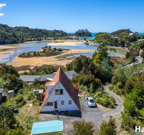 Just 400m from Kaiteriteri beach, this charming 'A frame' bach boasts breathtaking sea, estuary, and bush views, creating a serene coastal haven